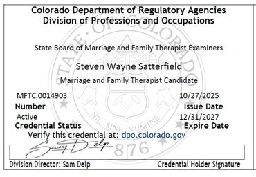 All information shared is confidential except the Department of Regulatory Agencies in Colorado requirement to report a plan to hurt oneself or others, including child or elder abuse. I am working towards licensure with them. I passed their jurisprudence exam and became a Marriage and Family Therapist Candidate with them in October, 2025.
